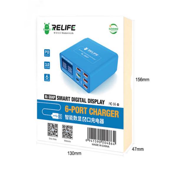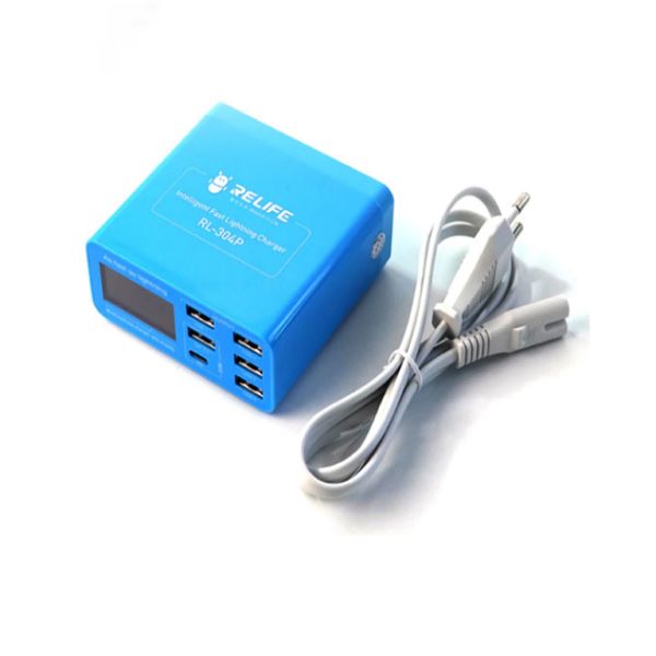 RL-304P RELIFE 6-Ports Digital Display Lightning Charger Suitable for charging all mobile phones and tablets. Fast Charging: Supports PD3.0 and QC3.0 fast charging. Compatibility: Suitable for various devices, including smartphones and tablets. Intelligent Charging: Automatically detects optimal charging speed for each device. Multiple Ports: Features 6 USB ports for charging multiple devices at once. Digital Display: Shows charging information such as voltage and current.