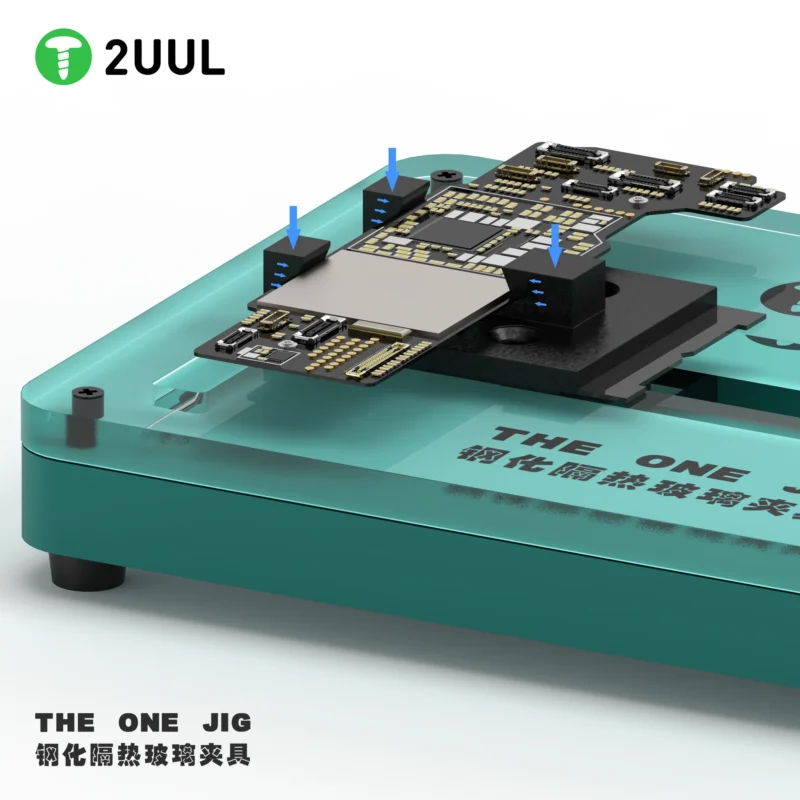 The 2UUL “The One Jig” with Tempered Glass for PCB Board Holder Fixture is a specialized tool designed for holding and working on printed circuit boards (PCBs) during various electronics and soldering tasks. “The One Jig” is primarily a fixture designed for securely holding PCBs during repair, soldering, and assembly tasks. It provides a stable and secure platform for working on PCBs. The fixture features a tempered glass surface that allows you to view and inspect the PCB beneath it. The glass provides a smooth and non-conductive working surface, making it suitable for various tasks, including soldering and component placement.